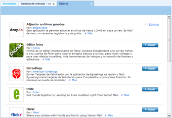 Las aplicaciones son una de las funciones introducidas recientemente en Yahoo! Mail, y permiten adjuntar archivos grandes vía Drop.io, álbumes fotográficos de Flickr o peticiones de pago con PayPal. Para usarlas en Yahoo! Mail hace falta darlas de alta por separado.